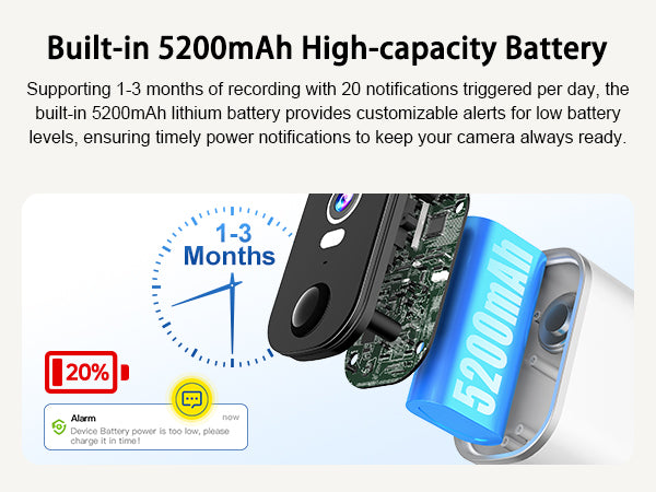 Supporting 1-3 months of recording with 20 notifications triggered per day, the built-in 5200mAh lithium battery provides customizable alerts for low battery levels, ensuring timely power notifications to keep your camera always ready.