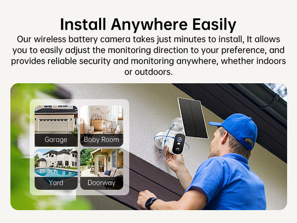 Our wireless battery camera takes just minutes to install, It allows you to easily adjust the monitoring direction to your preference, and provides reliable security and monitoring anywhere, whether indoorsor outdoors.