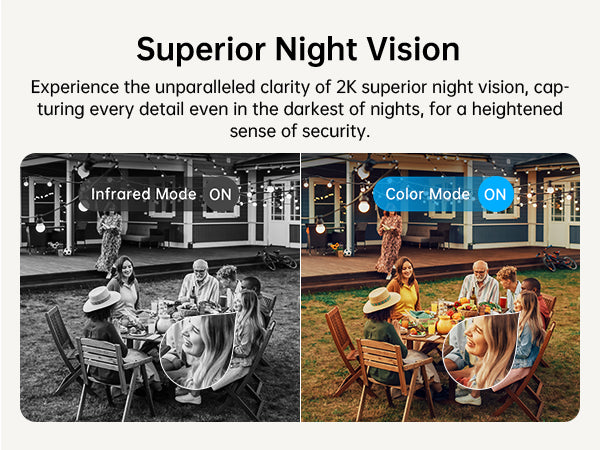 Experience the unparalleled clarity of 2K superior night vision, cap-turing every detail even in the darkest of nights, for a heightenedsense of security.