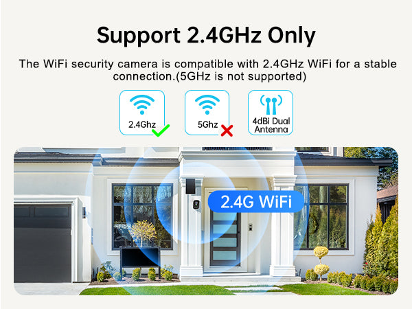 The WiFi security camera is compatible with2.4GHz WiFi for a stable connection.(5GHz is not supported)