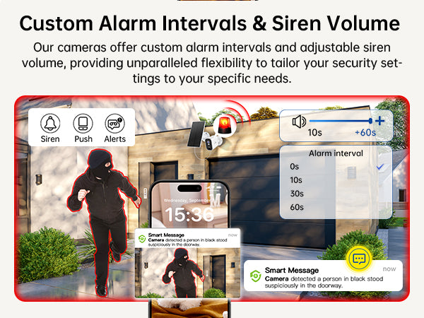Our cameras offer custom alarm intervals and adjustable siren volume, providing unparalleled flexibility to tailor your security set-tings to your specific needs.