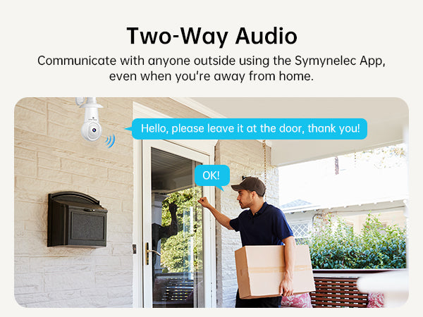 Our Two-Way Audio feature enables seamless communication through your security camera, allowing you to listen and speak directly to anyone on the other end. This capability enhances your home security system by facilitating real-time interaction, whether you're welcoming guests, instructing delivery personnel, or addressing potential intruders. With Two-Way Audio, your security cameras provide added convenience and peace of mind.