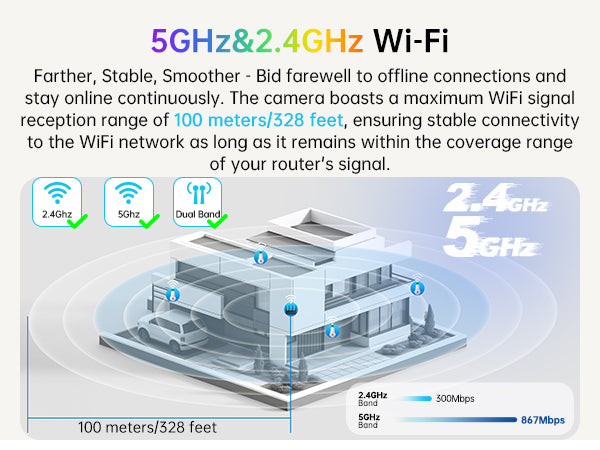 Upgraded Dual-Band WiFi: Compatible with 5GHz/2.4GHz networks for smooth, low-latency streaming. With a range of up to 328 feet, enjoy seamless setup and uninterrupted surveillance.