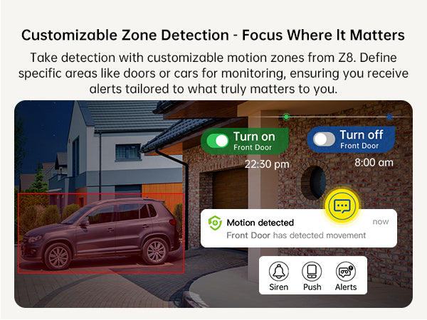 Our Customizable Zone Detection feature allows you to define specific areas for monitoring within your property. This capability ensures your home security system focuses on important zones, minimizing unnecessary alerts from outside traffic or wildlife. With this targeted approach, your security cameras provide efficient surveillance and peace of mind by monitoring only the areas you care about.