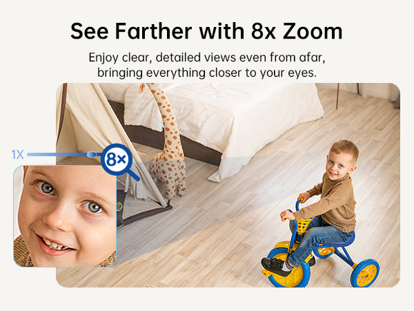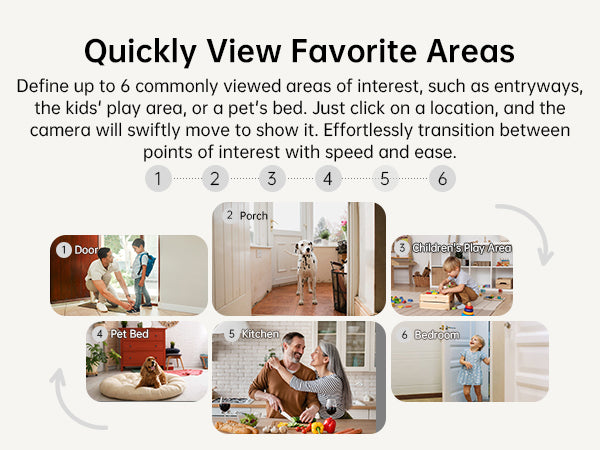 Assign up to 6 key areas, such as entryways, the kids' play zone, or your pet's bed. With a single click, the camera instantly moves to your selected zone, providing fast transitions between your defined monitoring points for seamless surveillance.