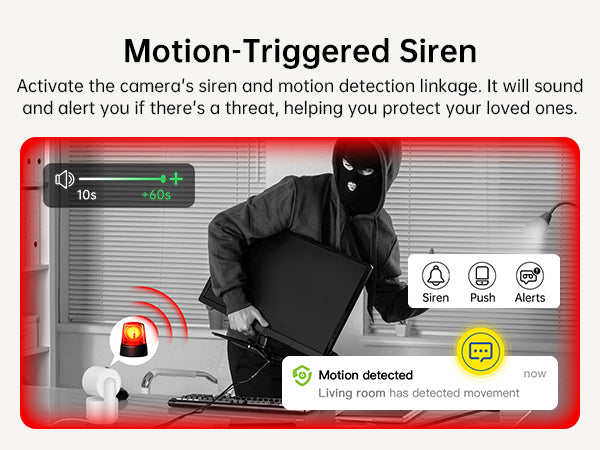 Visión nocturna por infrarrojos y sirena: equipada con visión nocturna por infrarrojos de hasta 33 pies, puede monitorear su espacio incluso en completa oscuridad. Active la sirena incorporada para ahuyentar a posibles intrusos.