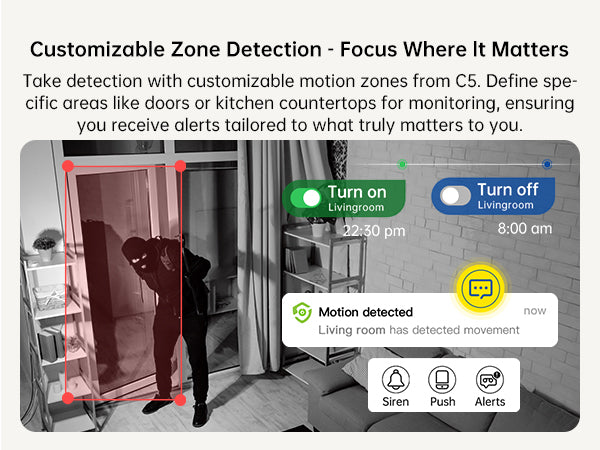 Our Customizable Zone Detection feature allows you to define specific areas for monitoring within your property. This capability ensures your home security system focuses on important zones, minimizing unnecessary alerts from outside traffic or wildlife. With this targeted approach, your security cameras provide efficient surveillance and peace of mind by monitoring only the areas you care about.
