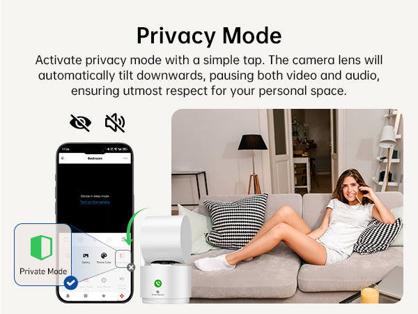With just one tap, activate Privacy Mode. The camera lens tilts downward, pausing both video and audio to protect your personal space whenever you need it.