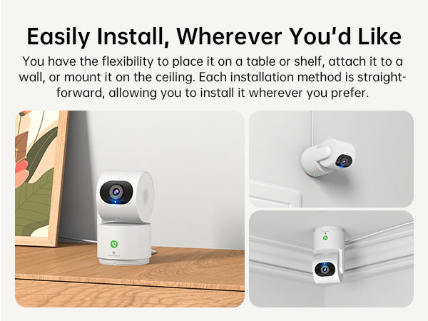 Easily place the camera on a table or shelf using its adhesive backing, mount it securely to a wall, or install it on the ceiling. Each installation method is designed for simplicity, giving you the freedom to set it up in the location that best suits your needs.