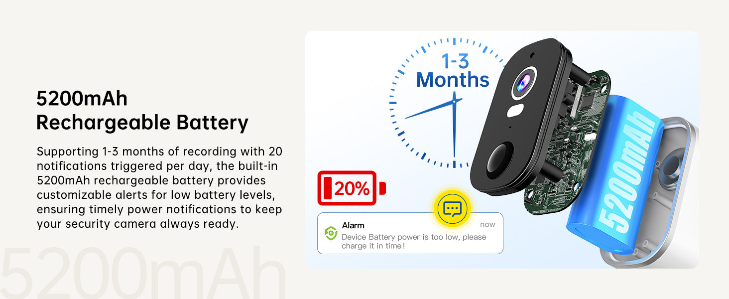 - Long-Lasting Battery: Equipped with a 5200mAh rechargeable battery, it lasts 2-6 months on a single charge, depending on usage. Receive low battery alerts to ensure continuous home security.