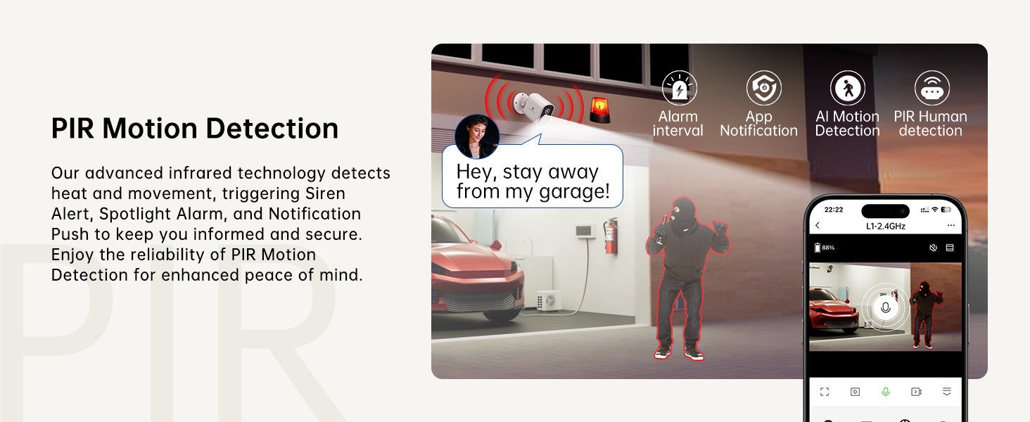- Advanced Motion Detection: AI and PIR heat sensors detect only relevant movements, reducing false alarms by 99%. Get instant alerts for human activity, ensuring quick response through the app.