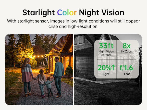Résolution HD 2K : profitez d'une vidéo claire de 3 MP avec zoom 8X, vision nocturne couleur et HDR. Des projecteurs activés par le mouvement et une alarme de 80 dB dissuadent les intrus.