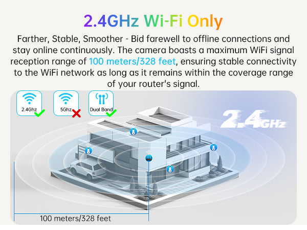 Nos caméras de sécurité utilisent le Wi-Fi 2,4 GHz pour une connexion stable et longue portée, garantissant des performances fiables pour votre système de sécurité domestique.