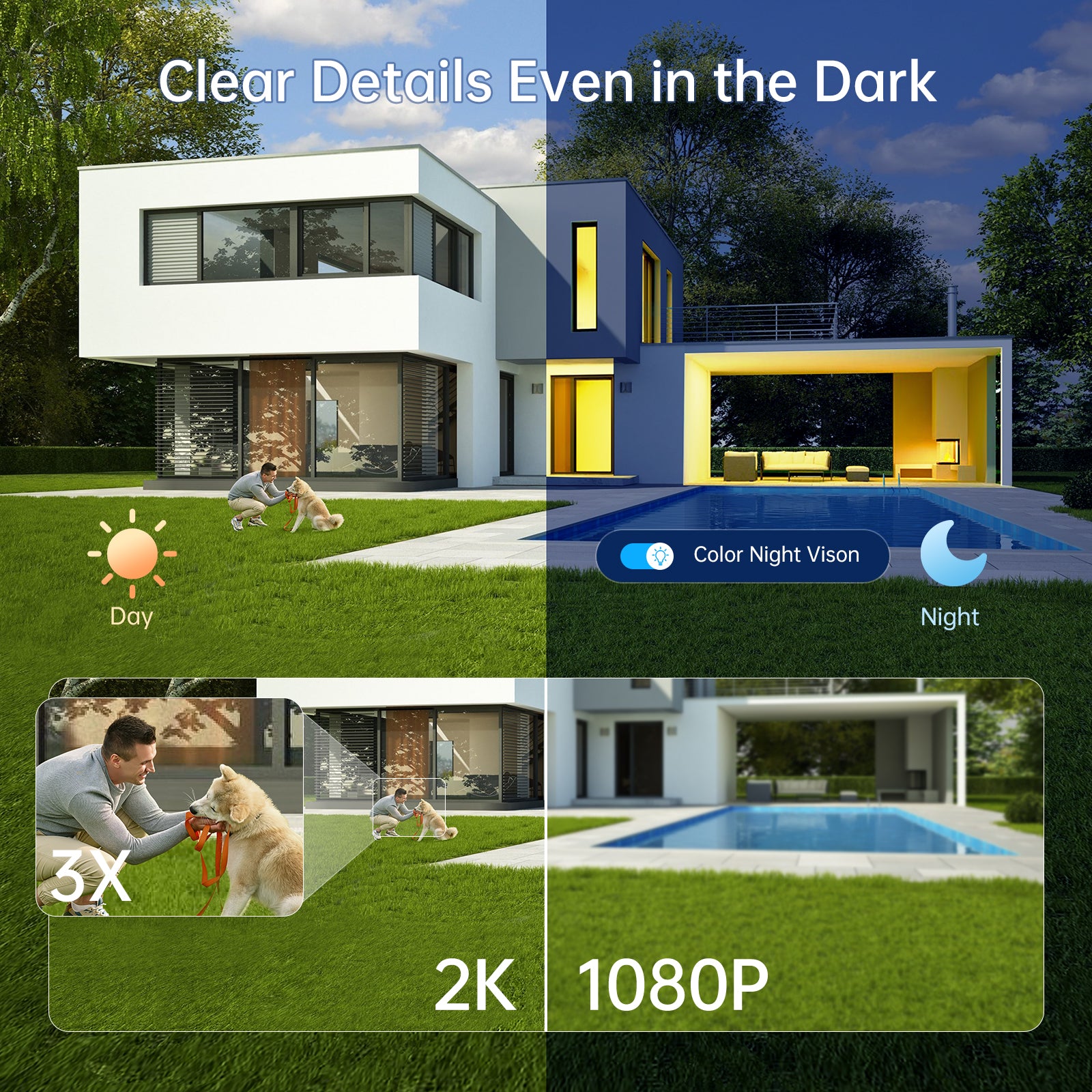 - 2K Ultra HD & Night Vision: Capture clear 2K 4MP HD video with a 95° wide-angle lens. Superior IR night vision and HDR extend up to 33 feet, providing detailed monitoring day and night.