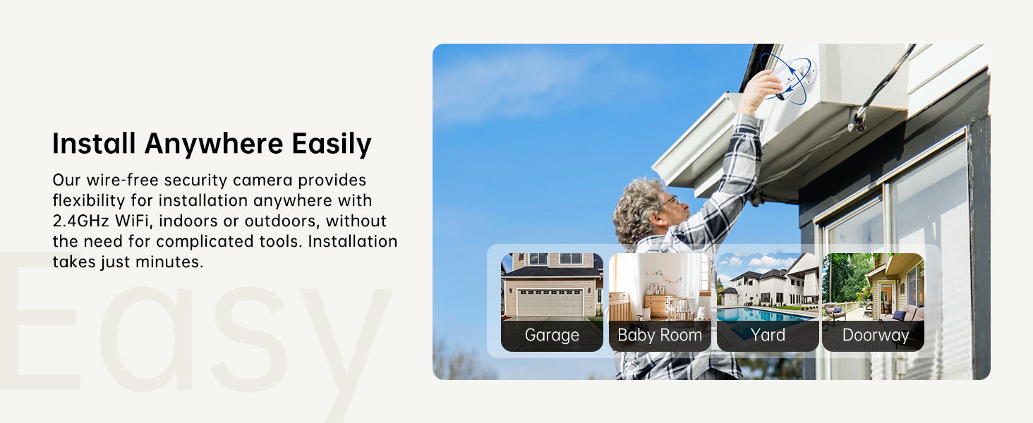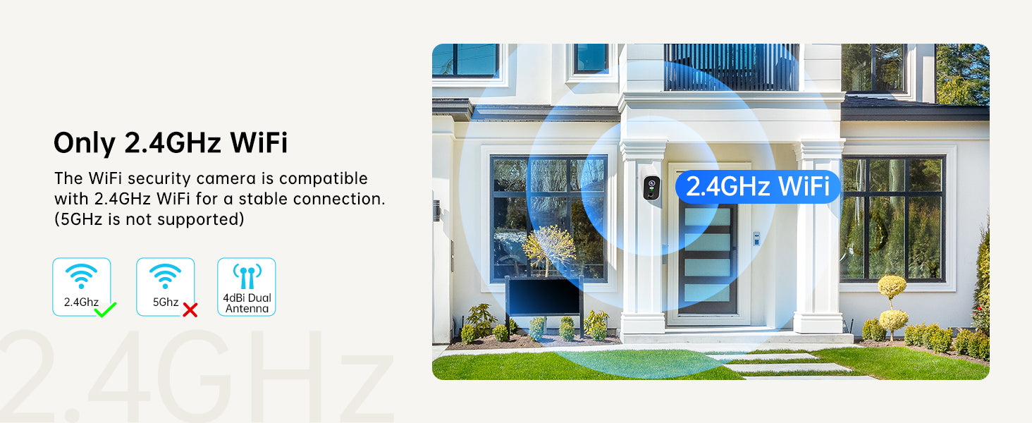 - 100% Wire-Free & Waterproof: Enjoy hassle-free installation with no wires required. This battery-powered WiFi camera is IP65 waterproof, making it reliable in any weather. Compatible with 2.4GHz WiFi networks only.