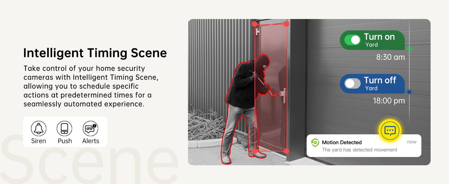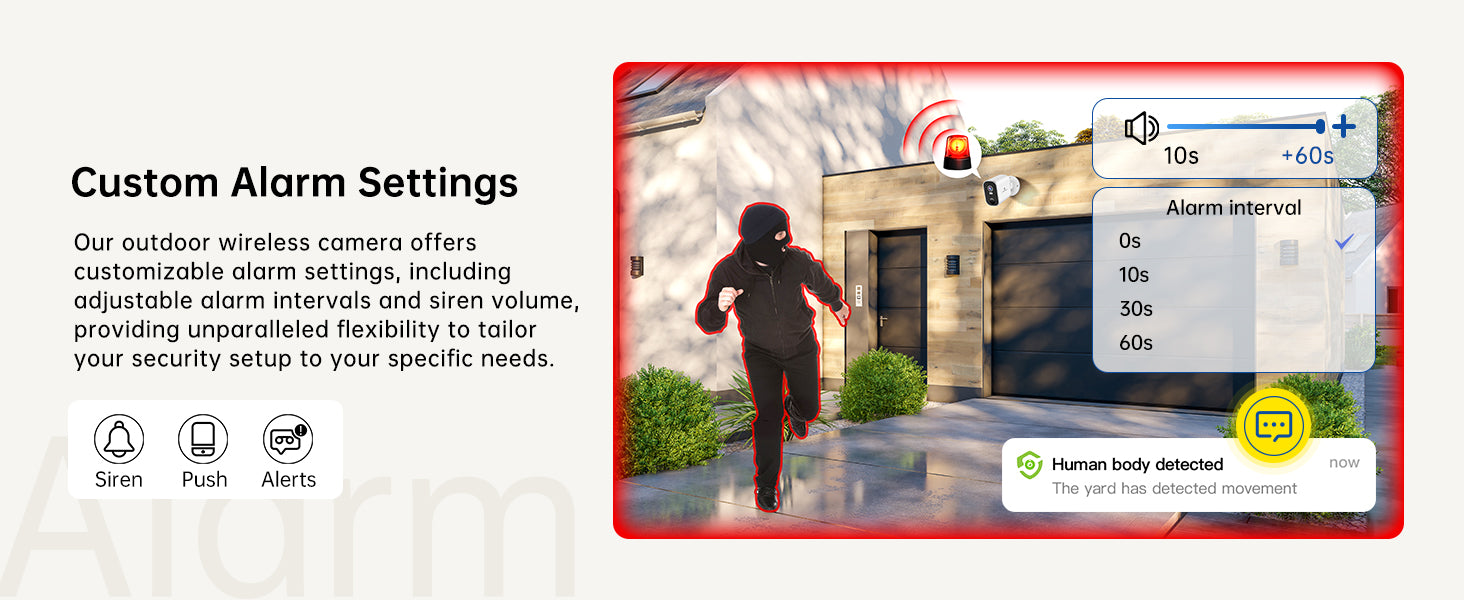 - Two-Way Audio & Siren: Communicate in real-time with two-way talk and deter intruders with a motion-activated siren. Receive immediate alarm notifications on your smartphone.
